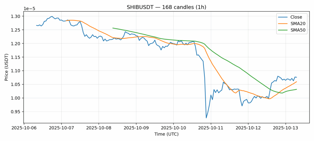 Shiba Inu — 1h candles, 7D window (SMA20/SMA50, RSI).