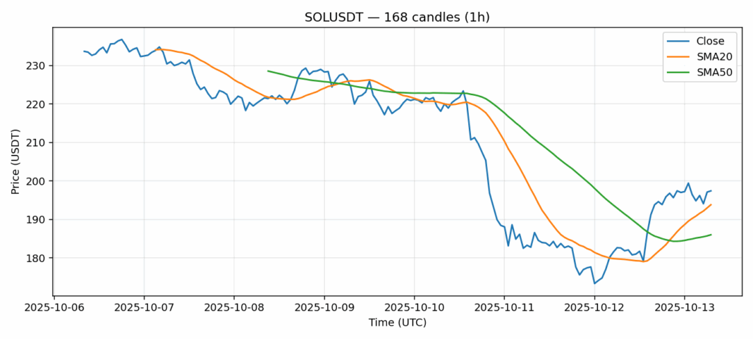 Solana — 1h candles, 7D window (SMA20/SMA50, RSI).