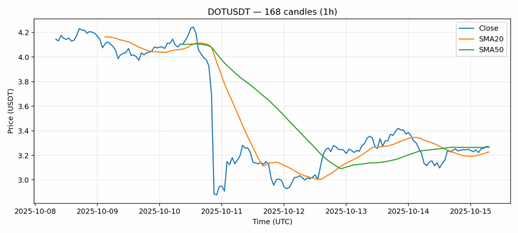Polkadot — 1h candles, 7D window (SMA20/SMA50, RSI).