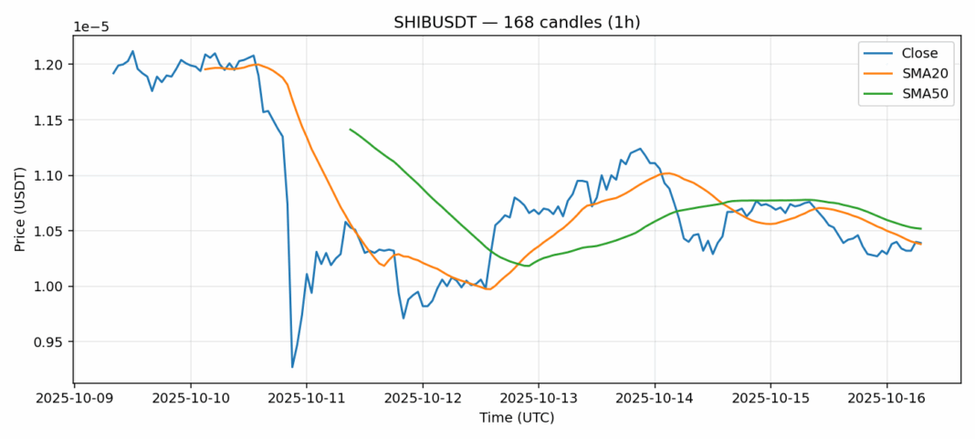 Shiba Inu — 1h candles, 7D window (SMA20/SMA50, RSI).