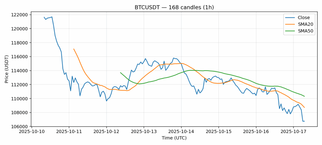 Bitcoin is showing concerning technical signals as it trades at $106,752, having declined 4.4% over the past 24 hours. The current price sits below both the 20-day SMA ($108,727) and 50-day SMA ($110,317), indicating bearish momentum in the near to medium term. The RSI reading of 37.87 suggests Bitcoin is approaching oversold territory but hasn’t yet reached extreme levels that typically signal a reversal. Trading volume remains substantial at $3.46 billion, indicating active participation in this downward move. The elevated volatility at 2.6% reflects heightened market uncertainty. For traders, this setup suggests caution – consider waiting for a confirmed bounce from oversold conditions before entering long positions. Short-term traders might look for resistance around the $108,000 level for potential short entries, while longer-term investors could view dips toward $105,000 as accumulation opportunities. Monitor for potential support establishment around current levels.