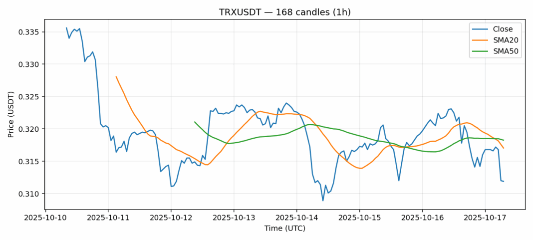 TRON — 1h candles, 7D window (SMA20/SMA50, RSI).