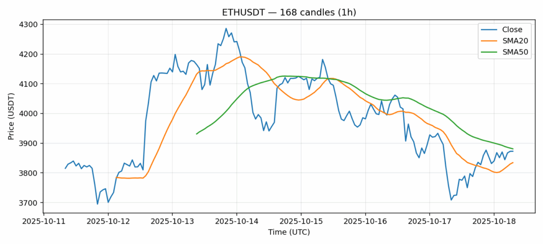 Ethereum — 1h candles, 7D window (SMA20/SMA50, RSI).