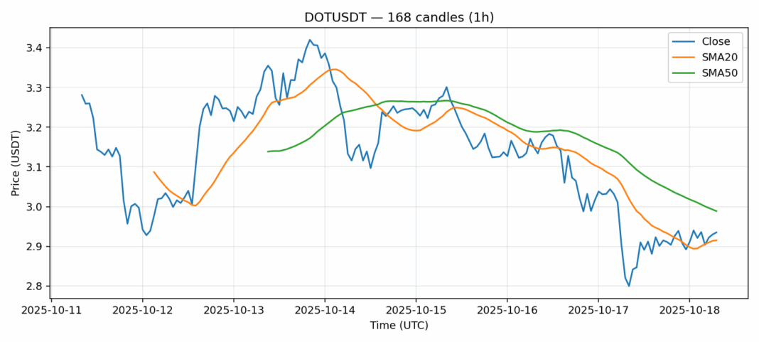 Polkadot — 1h candles, 7D window (SMA20/SMA50, RSI).