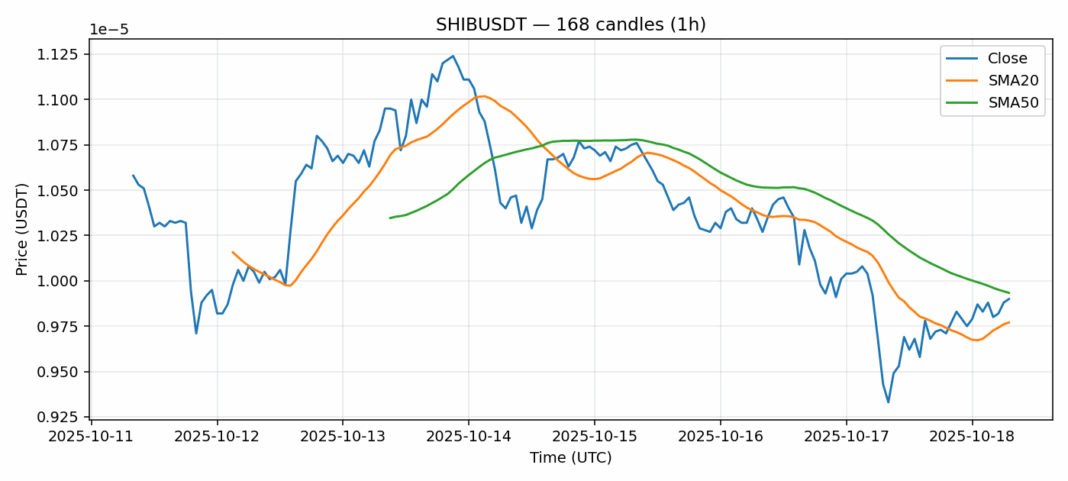 Shiba Inu — 1h candles, 7D window (SMA20/SMA50, RSI).