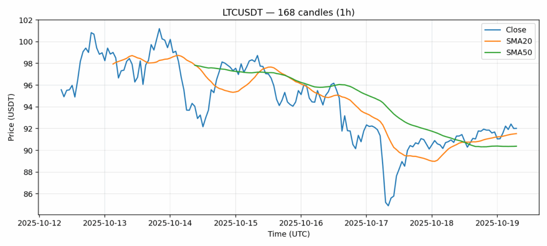 Litecoin — 1h candles, 7D window (SMA20/SMA50, RSI).