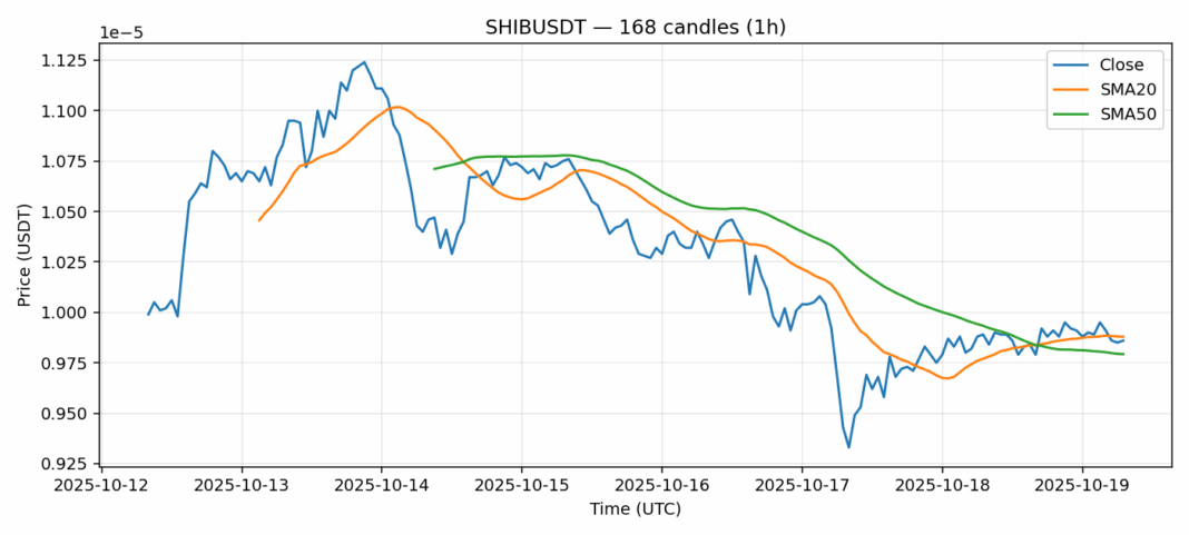Shiba Inu — 1h candles, 7D window (SMA20/SMA50, RSI).