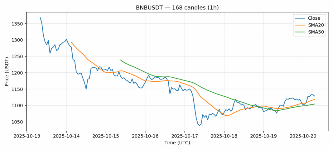 BNB — 1h candles, 7D window (SMA20/SMA50, RSI).