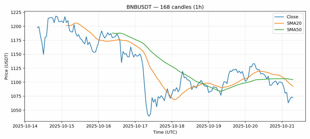 BNB — 1h candles, 7D window (SMA20/SMA50, RSI).