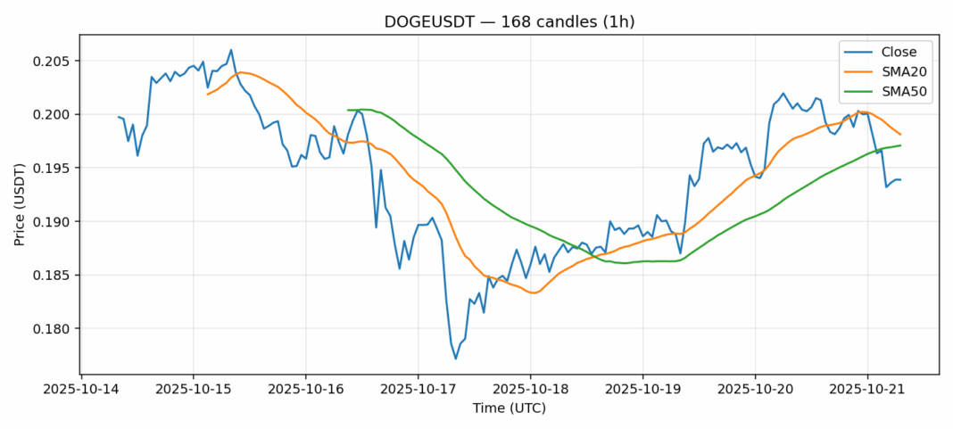 Dogecoin — 1h candles, 7D window (SMA20/SMA50, RSI).