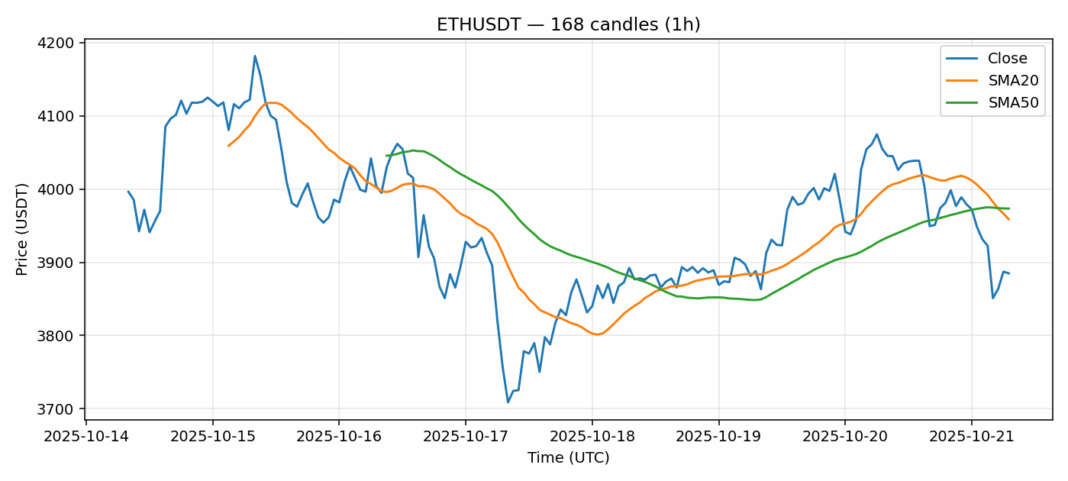 Ethereum — 1h candles, 7D window (SMA20/SMA50, RSI).