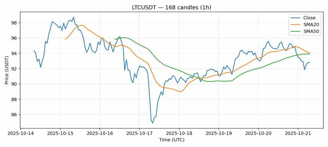 Litecoin — 1h candles, 7D window (SMA20/SMA50, RSI).