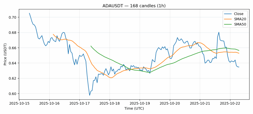 Cardano — 1h candles, 7D window (SMA20/SMA50, RSI).
