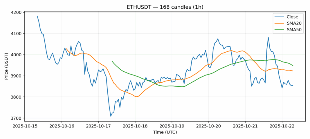 Ethereum — 1h candles, 7D window (SMA20/SMA50, RSI).