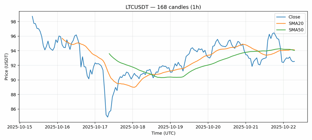 Litecoin — 1h candles, 7D window (SMA20/SMA50, RSI).