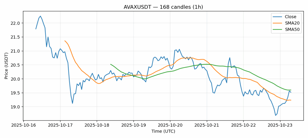AVAX is showing modest strength today, trading at $19.52 with a 0.67% gain over the past 24 hours. The current price sits comfortably above the 20-day SMA of $19.24, indicating near-term bullish momentum, though it remains slightly below the 50-day SMA of $19.60, suggesting some resistance overhead. With an RSI of 57.5, AVAX is approaching overbought territory but still has room for upward movement before hitting extreme levels. The 24-hour trading volume of $57.8 million demonstrates healthy market participation, while volatility at 4.34% suggests relatively stable conditions for a crypto asset. Traders should watch for a decisive break above the $19.60 level, which could trigger further gains toward the $20 psychological barrier. Support appears firm around $19.20-$19.30, making this a logical area for stop-loss placements. Given the current technical setup, cautious optimism is warranted, though position sizing should remain conservative until clearer directional momentum emerges.