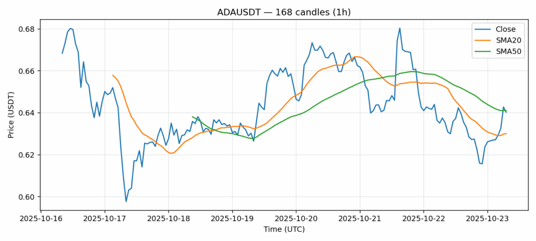 Cardano — 1h candles, 7D window (SMA20/SMA50, RSI).