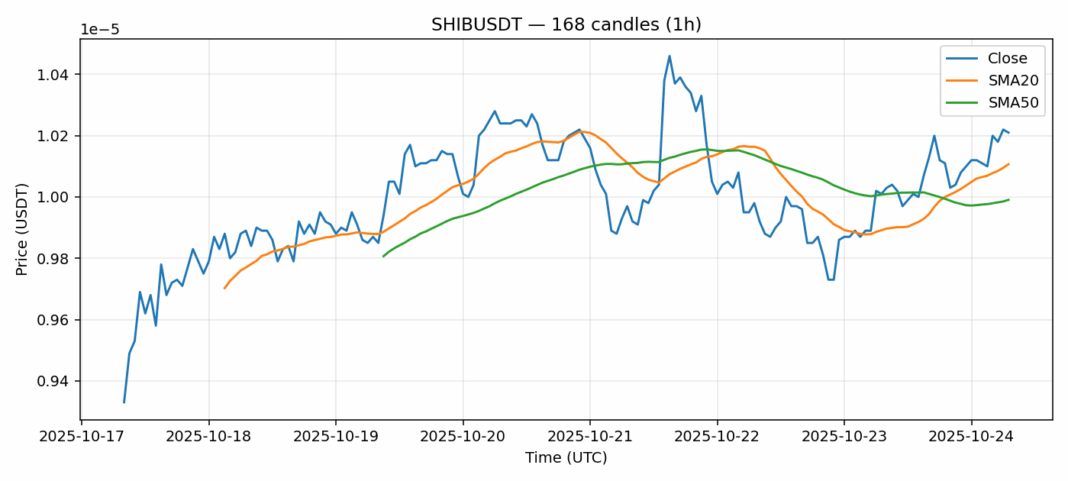 Shiba Inu — 1h candles, 7D window (SMA20/SMA50, RSI).