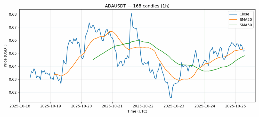 Cardano — 1h candles, 7D window (SMA20/SMA50, RSI).