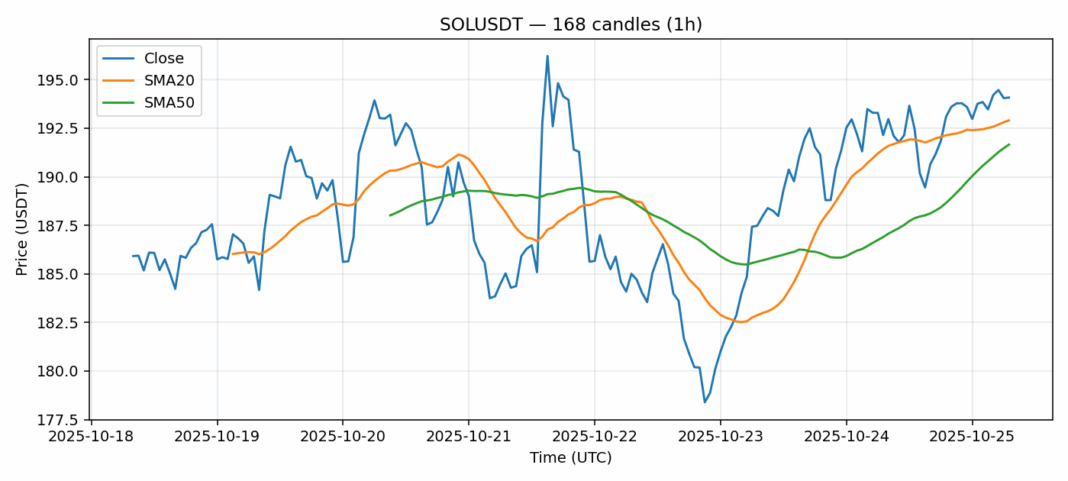 Solana — 1h candles, 7D window (SMA20/SMA50, RSI).