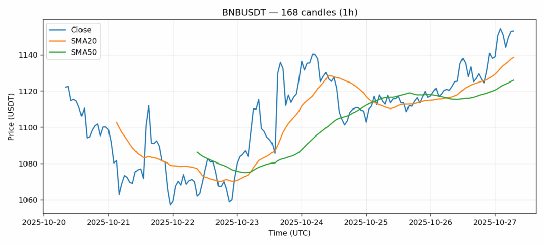 BNB — 1h candles, 7D window (SMA20/SMA50, RSI).