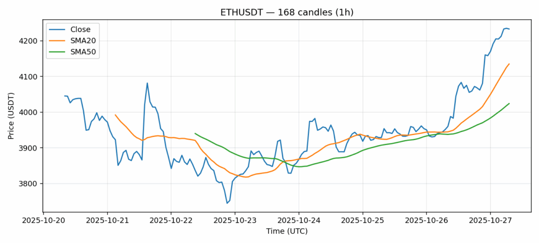 Ethereum — 1h candles, 7D window (SMA20/SMA50, RSI).