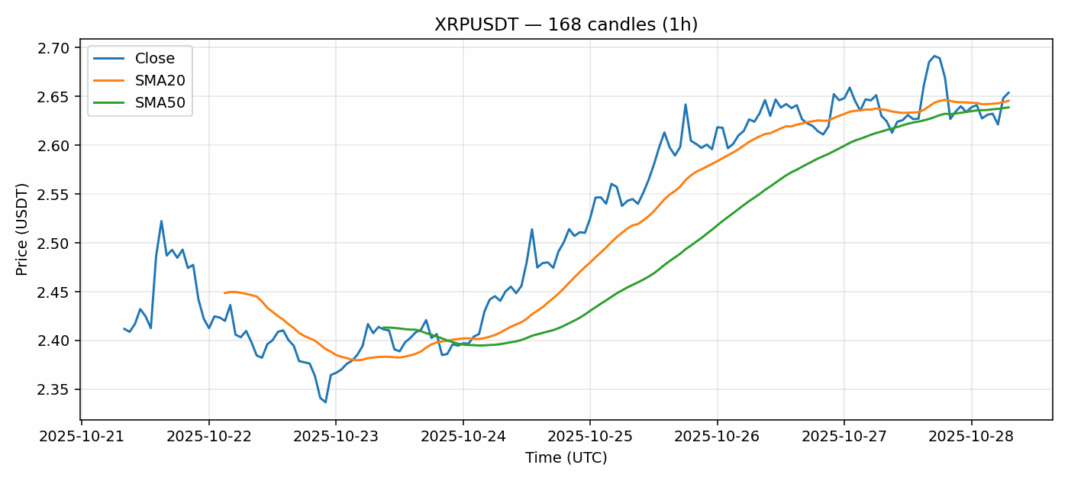 XRP is showing intriguing technical signals at the current $2.65 level, with the price hovering just above both its 20-day and 50-day simple moving averages. The 9.25% surge over the past 24 hours on substantial $279 million volume indicates strong buying pressure, though the RSI reading of 37.7 suggests the asset remains in oversold territory despite the recent gains. This divergence creates an interesting setup where momentum appears to be building while technical indicators haven’t yet caught up to the price action. The relatively low volatility of 2.95% compared to typical crypto standards suggests this move may have room to run without immediate exhaustion. Traders should watch for a sustained break above the $2.68 resistance level, which could trigger further upside toward the $2.75-$2.80 range. Consider scaling into positions on any pullbacks toward the $2.60 support zone, keeping stops tight given the overall market uncertainty.