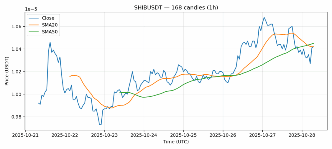 Shiba Inu — 1h candles, 7D window (SMA20/SMA50, RSI).