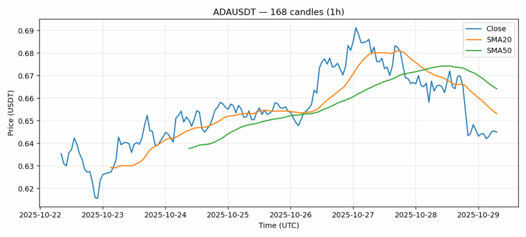 Cardano — 1h candles, 7D window (SMA20/SMA50, RSI).