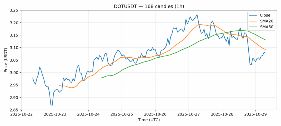 Polkadot — 1h candles, 7D window (SMA20/SMA50, RSI).