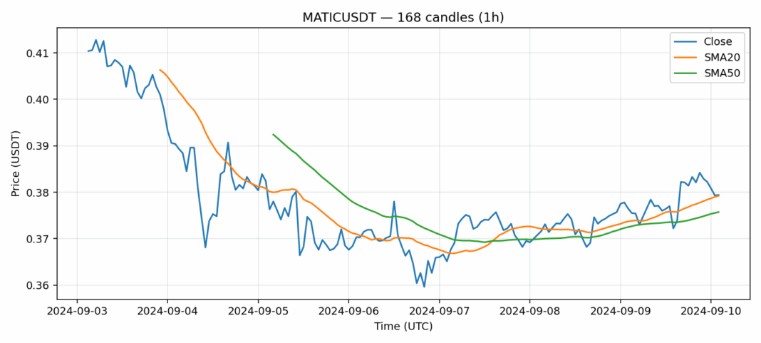 MATIC is showing consolidation around the $0.379 level after a modest 24-hour decline of 0.29%. Trading volume remains healthy at $1.07M, indicating sustained market interest. The RSI at 55.68 suggests neutral momentum with slight bullish bias, while price trading above both the 20-day SMA ($0.3792) and 50-day SMA ($0.3757) indicates underlying strength. Current volatility of 3.84% provides reasonable trading ranges without excessive risk. For traders, consider accumulating on dips toward the $0.375 support level with stops below $0.372. Upside targets appear at $0.385-$0.390 resistance zone. The technical setup favors range-bound trading with cautious optimism, though broader market sentiment remains the key driver. Position sizing should account for potential volatility spikes given MATIC’s historical price action patterns.