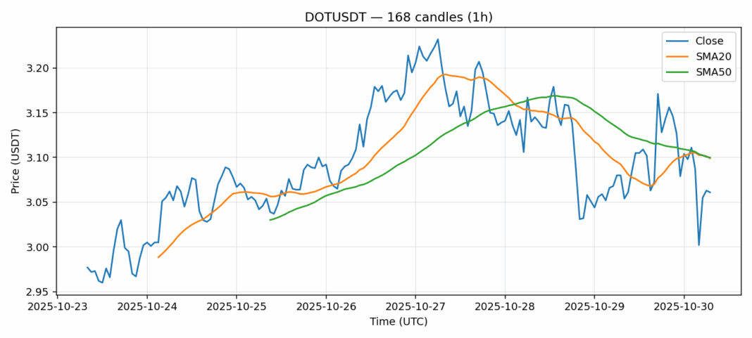 Polkadot — 1h candles, 7D window (SMA20/SMA50, RSI).