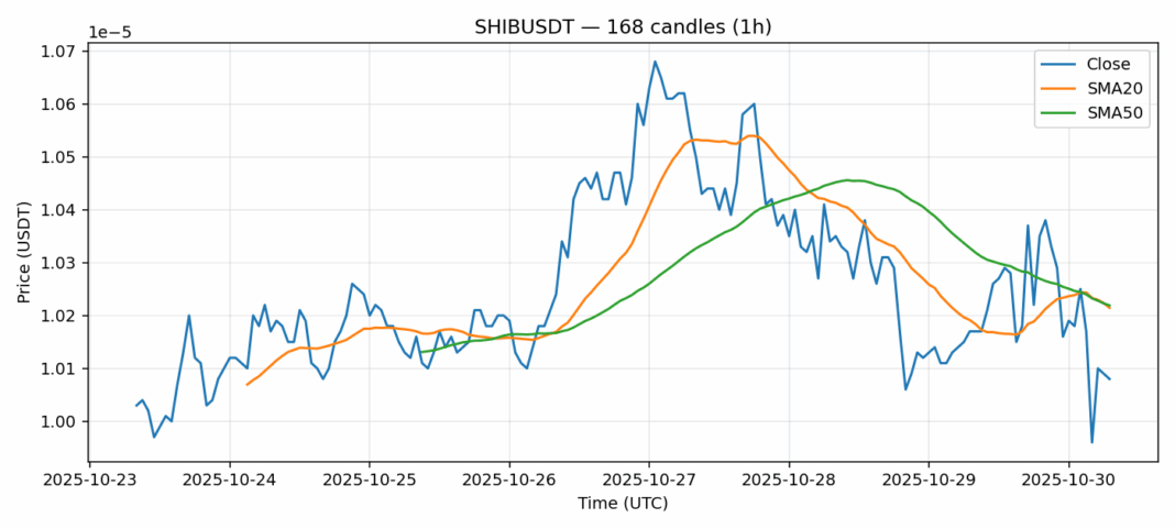 Shiba Inu — 1h candles, 7D window (SMA20/SMA50, RSI).