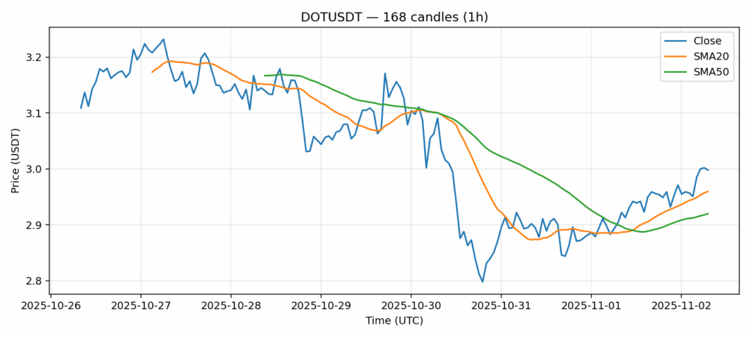 Polkadot — 1h candles, 7D window (SMA20/SMA50, RSI).