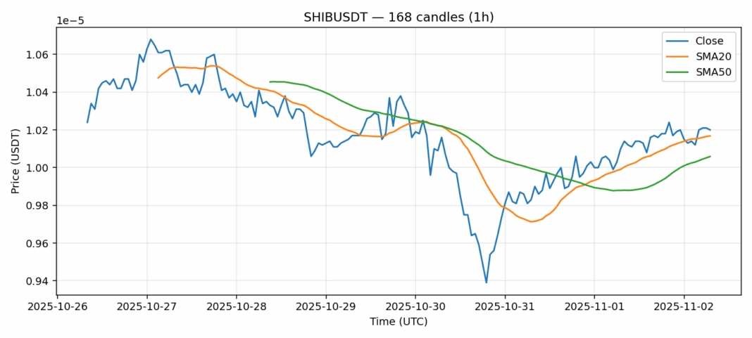 Shiba Inu — 1h candles, 7D window (SMA20/SMA50, RSI).