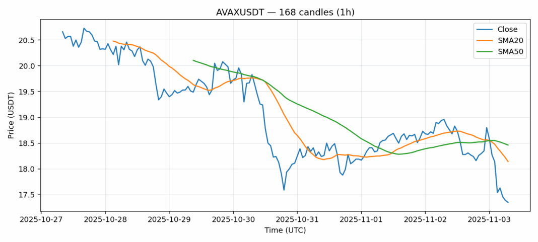 Avalanche — 1h candles, 7D window (SMA20/SMA50, RSI).
