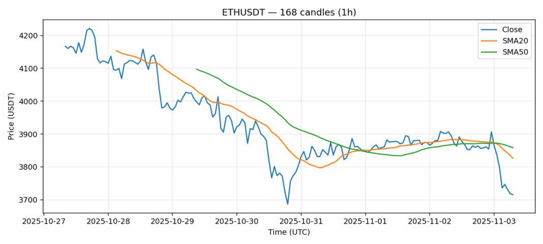 Ethereum — 1h candles, 7D window (SMA20/SMA50, RSI).