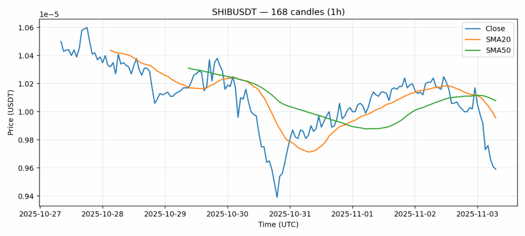 Shiba Inu — 1h candles, 7D window (SMA20/SMA50, RSI).