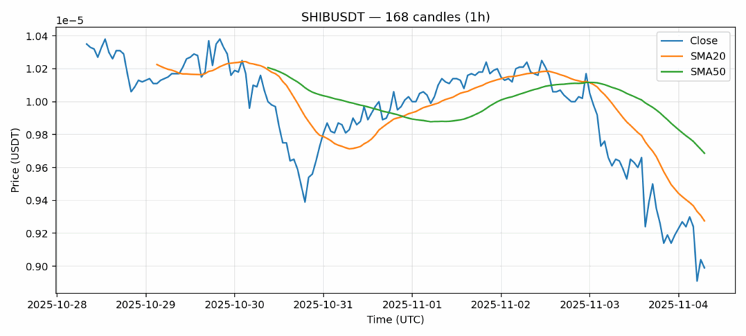 Shiba Inu — 1h candles, 7D window (SMA20/SMA50, RSI).