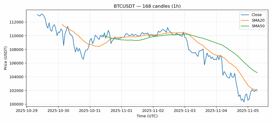 Bitcoin — 1h candles, 7D window (SMA20/SMA50, RSI).