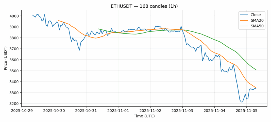 Ethereum faces significant headwinds as ETHUSDT trades at $3,338, down nearly 5% over the past 24 hours. The current price sits just below the 20-day SMA at $3,343, indicating weakening short-term momentum, while the substantial gap below the 50-day SMA at $3,509 suggests persistent medium-term pressure. The RSI reading of 45.55 shows ETH is approaching oversold territory but hasn’t reached extreme levels yet. Trading volume remains robust at over $5.2 billion, confirming active participation in this downturn. The 4.17% volatility reading indicates elevated price swings, typical during corrective phases. For traders, current levels might present accumulation opportunities for those with longer time horizons, but strict risk management is essential. Consider waiting for RSI to dip below 40 for better entry points, with key support around $3,250-$3,280. Resistance sits firmly at the 20-day SMA, which ETH must reclaim to signal any meaningful recovery.