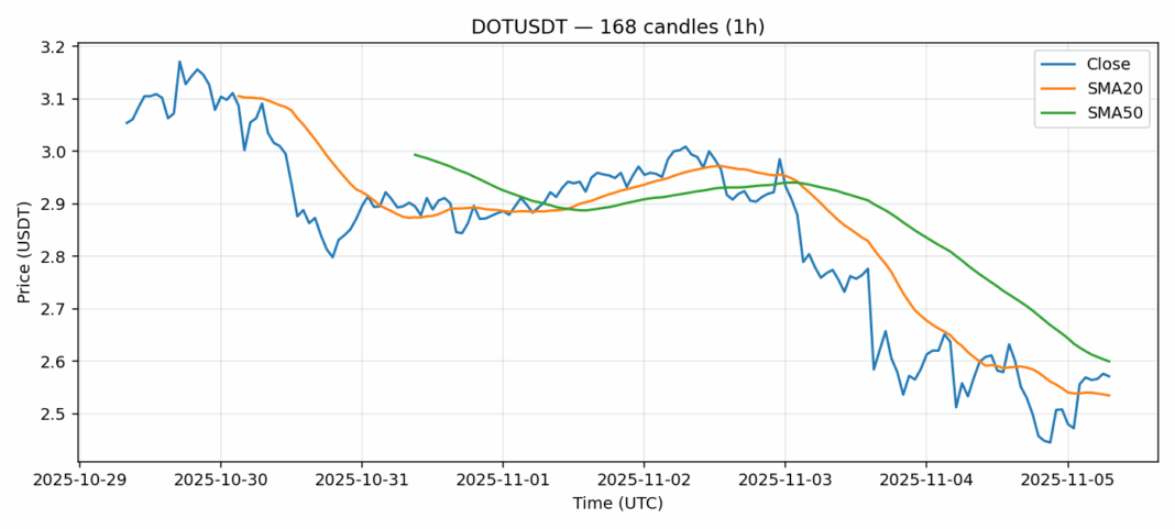 Polkadot — 1h candles, 7D window (SMA20/SMA50, RSI).