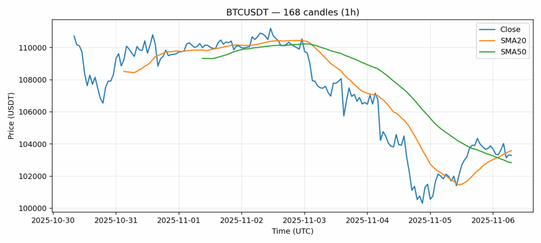 Bitcoin — 1h candles, 7D window (SMA20/SMA50, RSI).