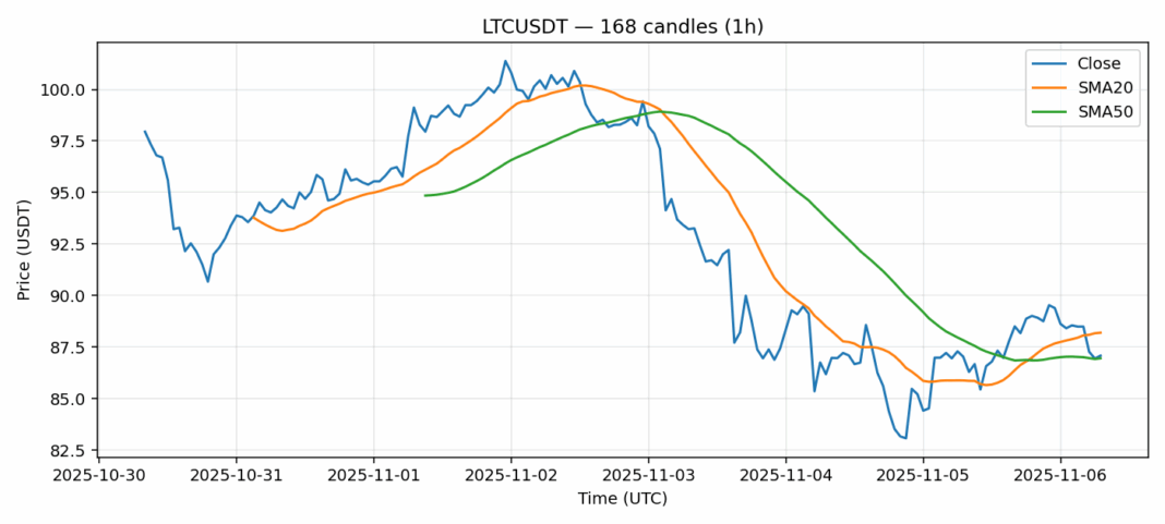Litecoin — 1h candles, 7D window (SMA20/SMA50, RSI).