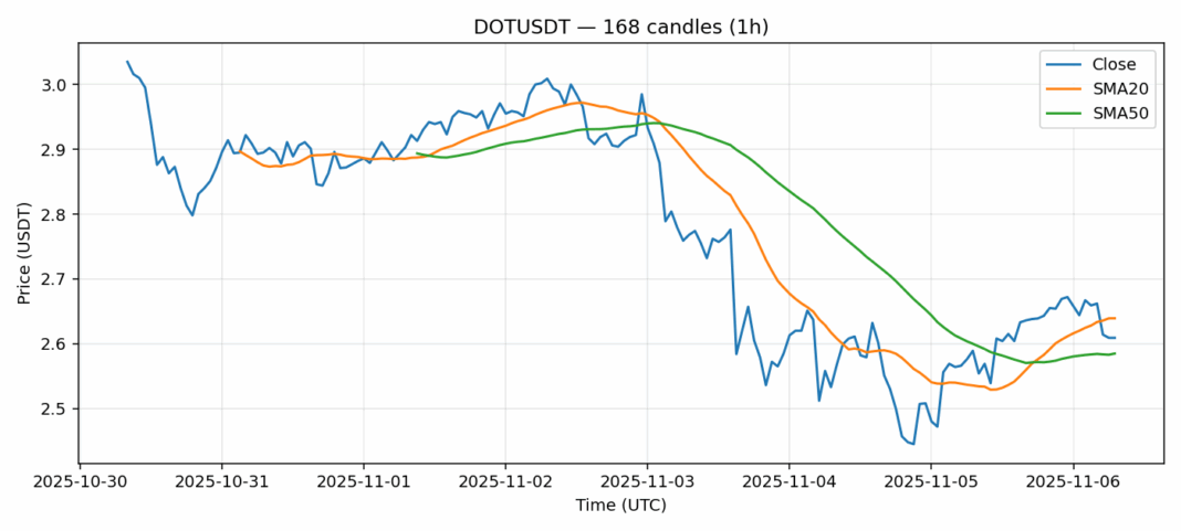 Polkadot — 1h candles, 7D window (SMA20/SMA50, RSI).