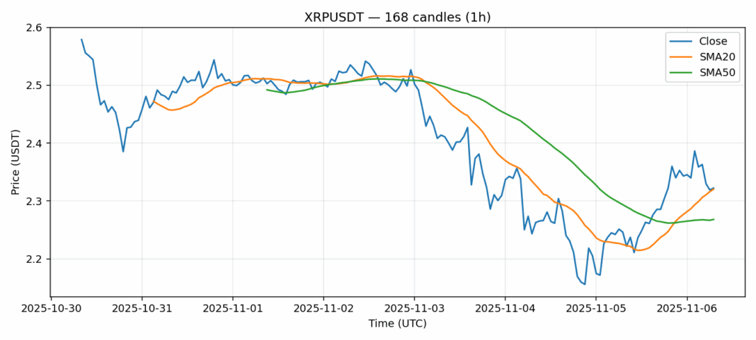 Ripple — 1h candles, 7D window (SMA20/SMA50, RSI).