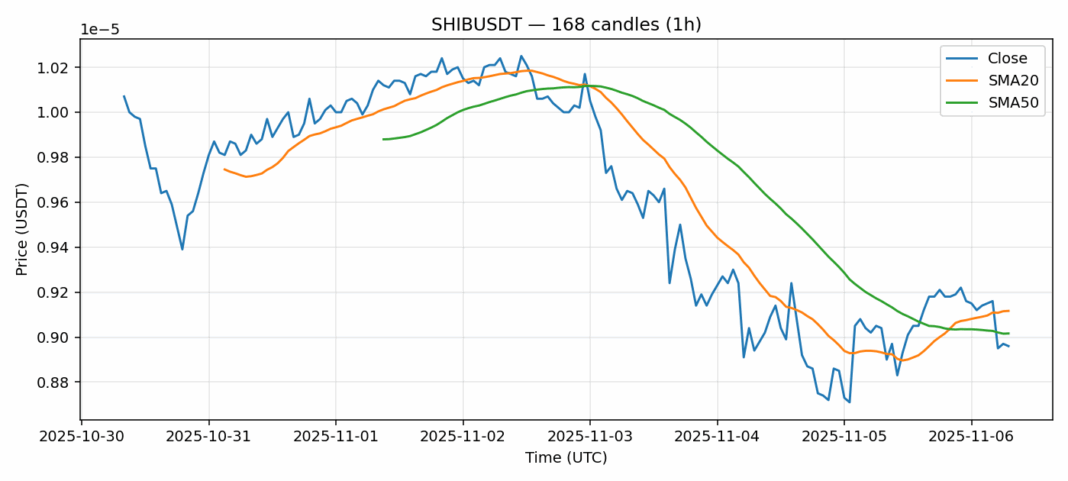 Shiba Inu — 1h candles, 7D window (SMA20/SMA50, RSI).