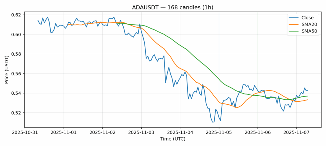 Cardano — 1h candles, 7D window (SMA20/SMA50, RSI).