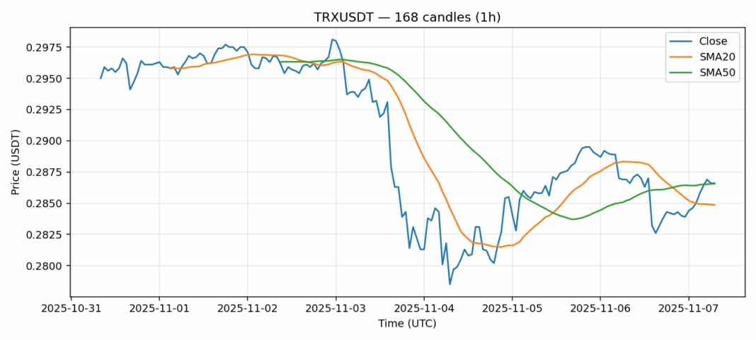 TRON — 1h candles, 7D window (SMA20/SMA50, RSI).