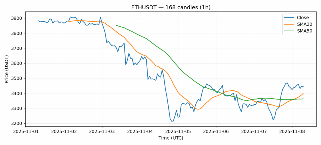 Ethereum — 1h candles, 7D window (SMA20/SMA50, RSI).